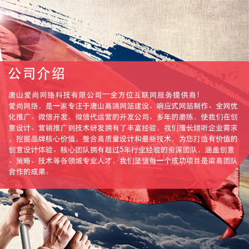 公司位于河北省唐山高新技術(shù)開發(fā)區(qū), 愛尚網(wǎng)絡(luò),旨在更好的為企業(yè)提供優(yōu)質(zhì)服務(wù),多年的磨煉,使我們在網(wǎng)站建設(shè),網(wǎng)站優(yōu)化到技術(shù)研發(fā)擁有了豐富經(jīng)驗。 我們擅長傾聽企業(yè)需求,挖掘品牌核心價值, 整合高質(zhì)量設(shè)計和新技術(shù),為企業(yè)打造有價值的創(chuàng)意設(shè)計體驗。核心團隊擁有超過4年以上行業(yè)經(jīng)驗,涵蓋創(chuàng)意,策化,開發(fā)等專業(yè)領(lǐng)域,我們堅信每一個成功項目合作,是愛尚技術(shù)實力的有效見證。